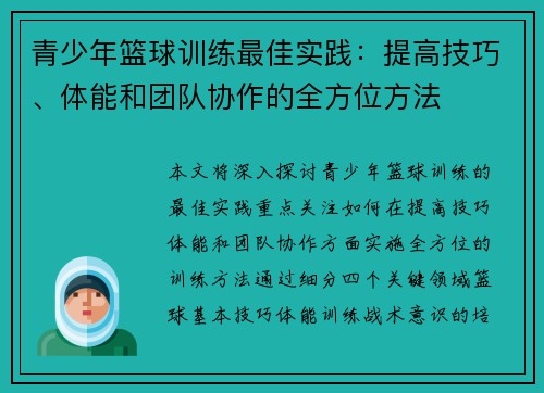 Read More阿贾克斯足球俱乐部的青训系统一直以来被视为全球最成功的青少年培养模式之一。该俱乐部凭借其卓越的青训体系,培养了无数世界级的球员,并为世界足坛输送了众多顶级人才。在这篇文章中,我们将详细剖析阿贾克斯青训模式的成功秘诀,从其独特的训练理念、创新的技术培训、重视心理素质培养以及完善的比赛经验积累等四个方面...